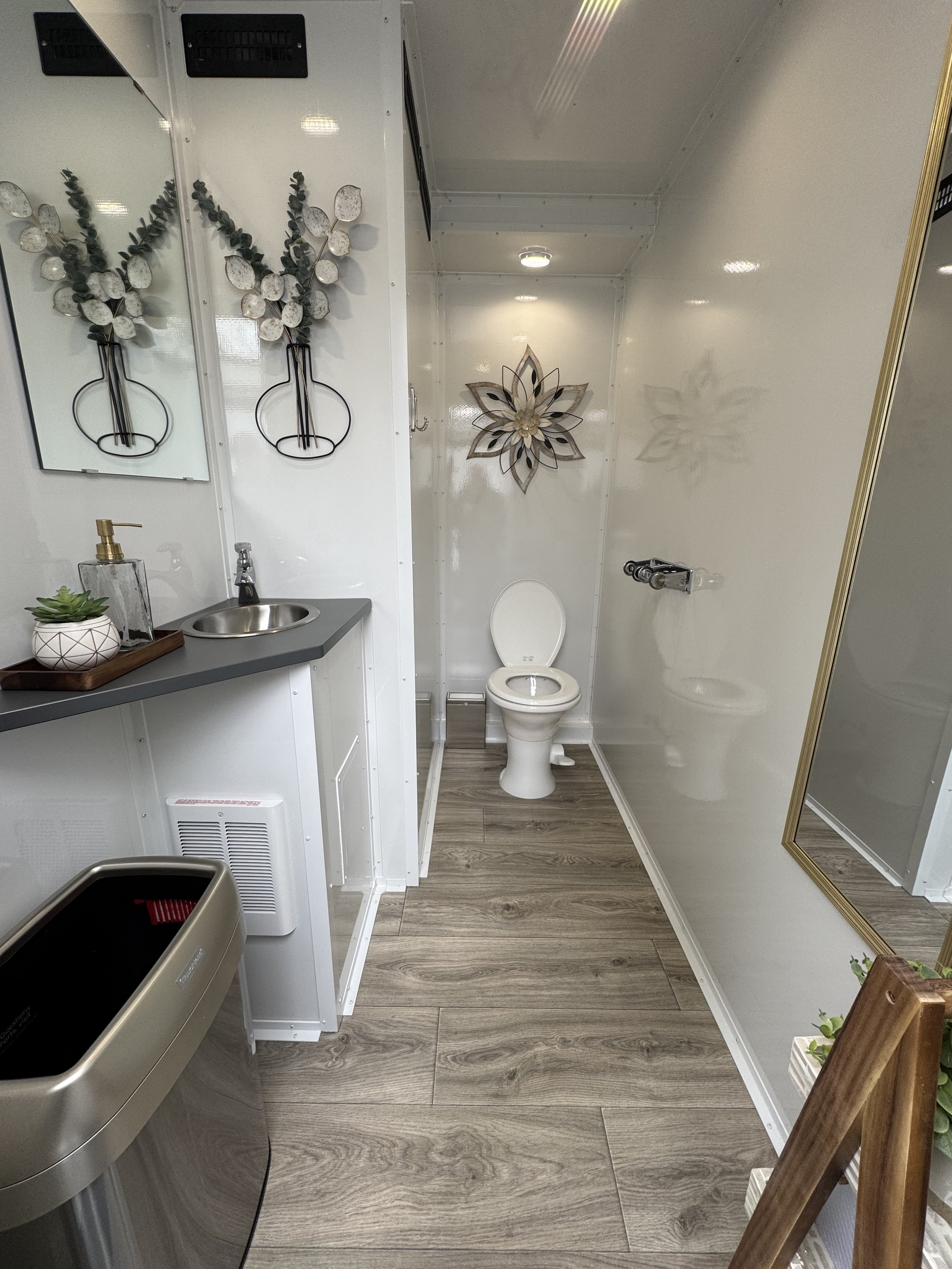 By far our most popular restroom trailer. Its compact size while still offering 5 stations makes it small enough to fit into small event spaces but it still has the capacity to handle larger crowds. We recommend using this size trailer for events with 150-300 guests